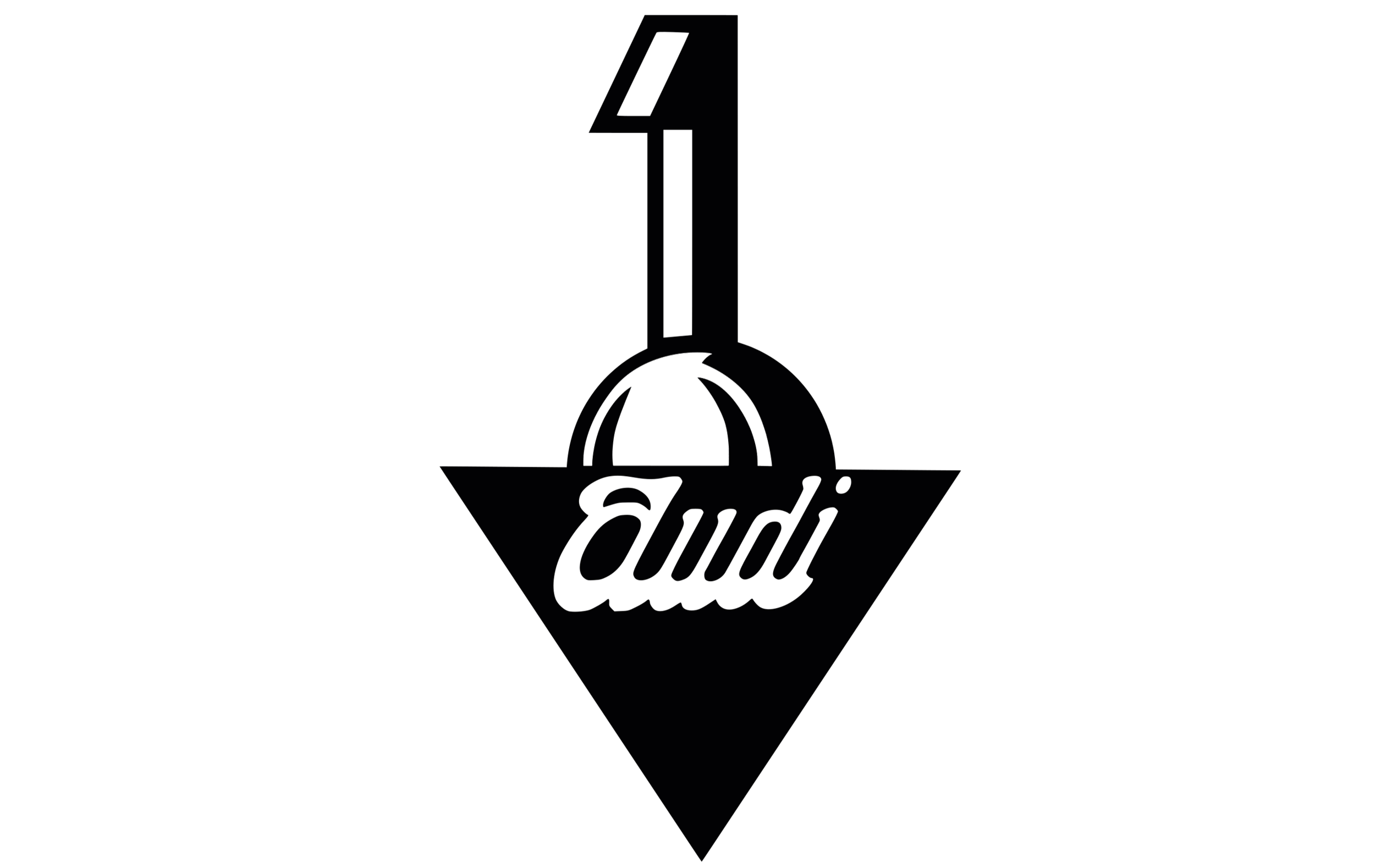 该徽章创建于 1909 年,仅被奥迪使用几个月,并于同年被其现代化版本取代。这一时期的第一次尝试看起来像一个巨大的数字“1”从一个球体中出来,这个球体半隐藏在黑色三角形后面,指向下方。“Audi”字标是用白色写的,黑色背景上窄了草书。